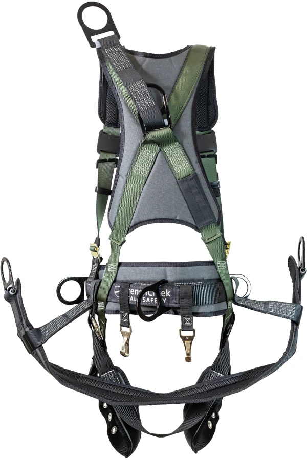 Derrick harness, seat saddle with d-rings, fully encircling waist pad with hip d-rings, removable tool belt, comfort shoulder/back pad, back dorsal d-ring with d-ring extension strap, back center work positioning d-ring.
