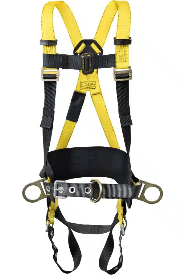Full Body Harness, single back dorsal d-ring, front waist d-ring, hip d-rings, tongue buckle legs, comfort waist pad, removable tool belt, 6 point adjustability.