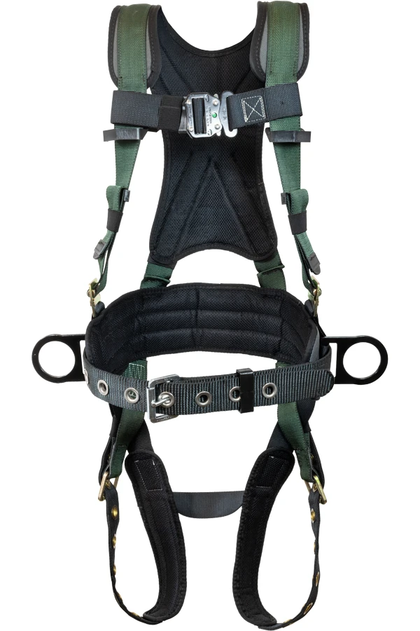 Stratos full body harness, comfort back/shoulder pad, leg pads, double ply rigid comfort waist pad, removable tool belt, reinforced belt loops, tongue buckle legs, single back dorsal d-ring, hip d-rings, 6 point adjustability